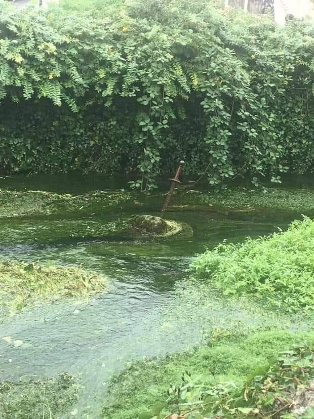As he wanders into the shallow waters where the stone lies, he hears a voice calling his name before he manages to get to it. Once he draws the sword, a great light floods the area, radiating energy to far off points.