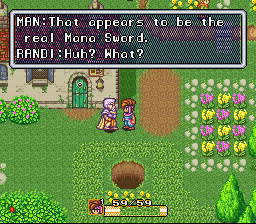 ELDER: … Oh, Randi! You’ve really caused me trouble! That Mana Sword was the protective deity of this village, and it’s probably because you pulled it out that monsters have suddenly begun appearing.