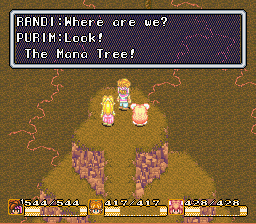Despite being thrown out of the town he’s lived in his whole life, Randi never mentions Potos again. He’ll soon meet Luka at the Water Palace, who explains most of the background of the entire game in one excruciatingly long speech. He’ll also meet his first companion, Purim, who rescues him from a group of man eating goblins. Purim goes on to join him for his entire adventure, and it’s left ambiguous if there’s a budding romance between them.