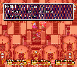 The last big moment for Randi comes at the end when he’s about to fight his final foe, the Mana Beast. If he’s successful, his friend Popoie will no longer be able to live in the same world. He also shows empathy for the Mana Beast who’s not inherently evil, but tragically can’t control its rage when confronted with the arrogant creation that’s the Mana Fortress.