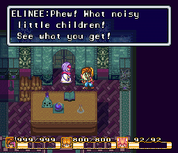 The dwarf Elder informs us that Elinee used to be a good witch, but we don’t know what this goodness entailed. She’s very famous in the Gaia Lowlands, and just about everyone knows she’s up to something. Among other things, she’s capable of zombifying an entire kingdom, sealing off entrances to magical palaces, teleportation, and keeping a menagerie of very deadly (but also some very adorable) monsters for protection. We can assume that she went evil solely due to the tragic situation in her forest: