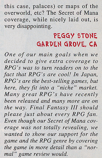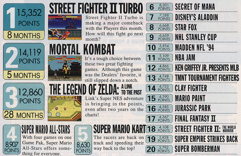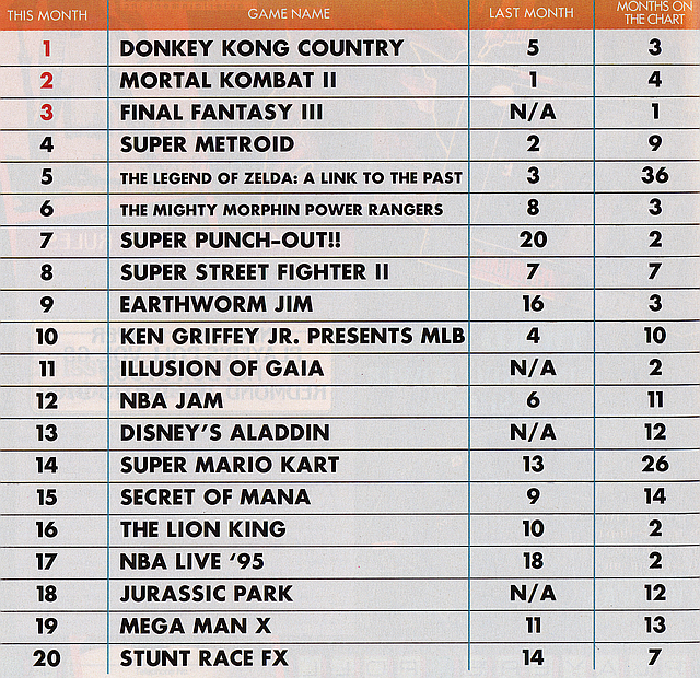 This issue was also the last to feature Secret of Mana in its Top 20, just as Final Fantasy III (VI) made its debut.
