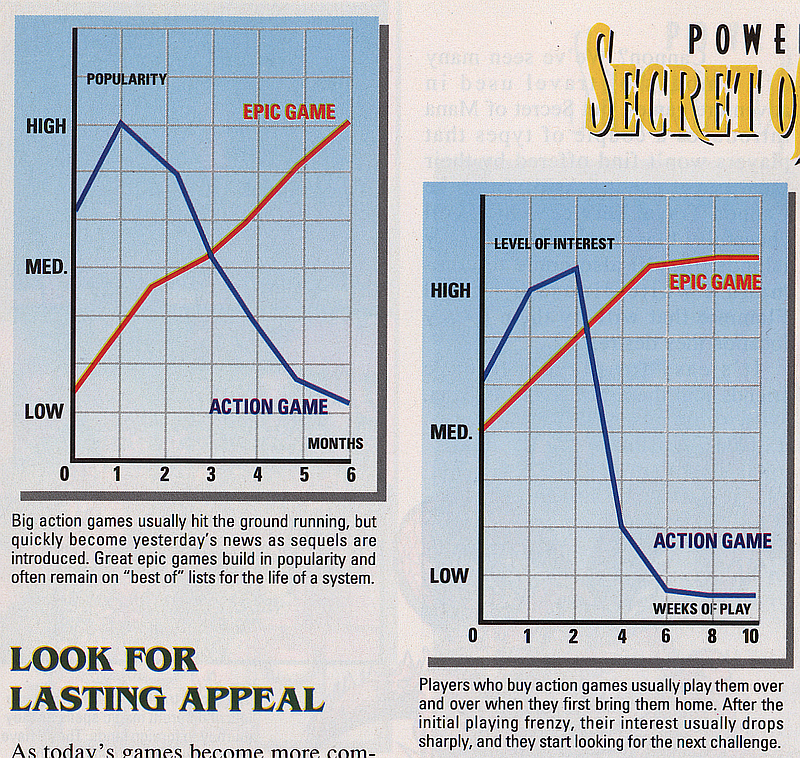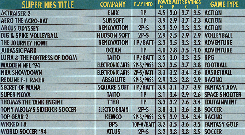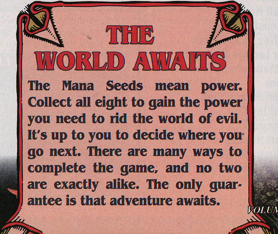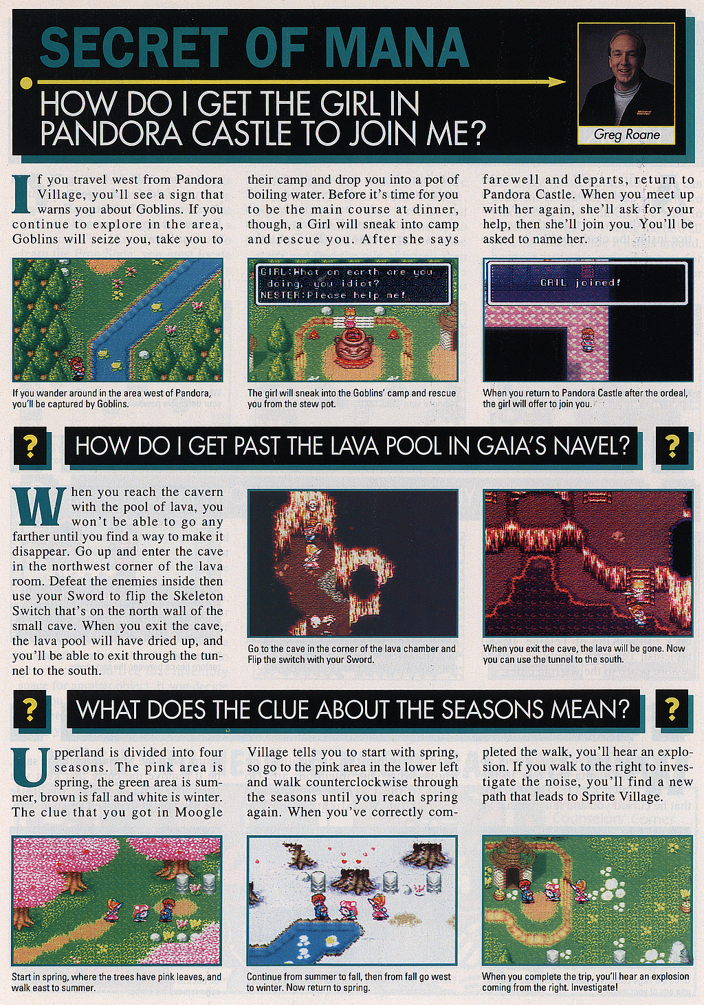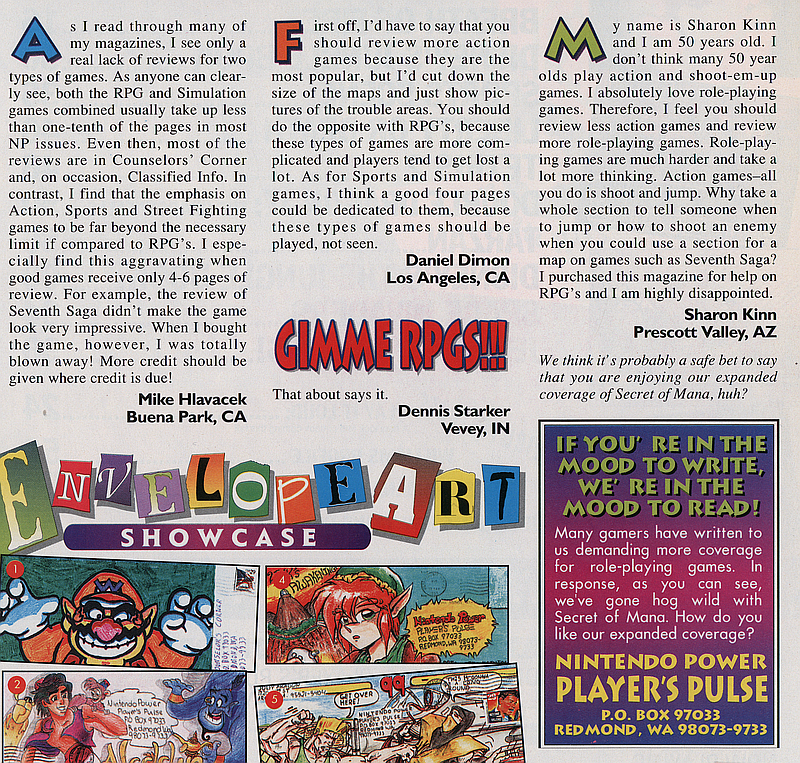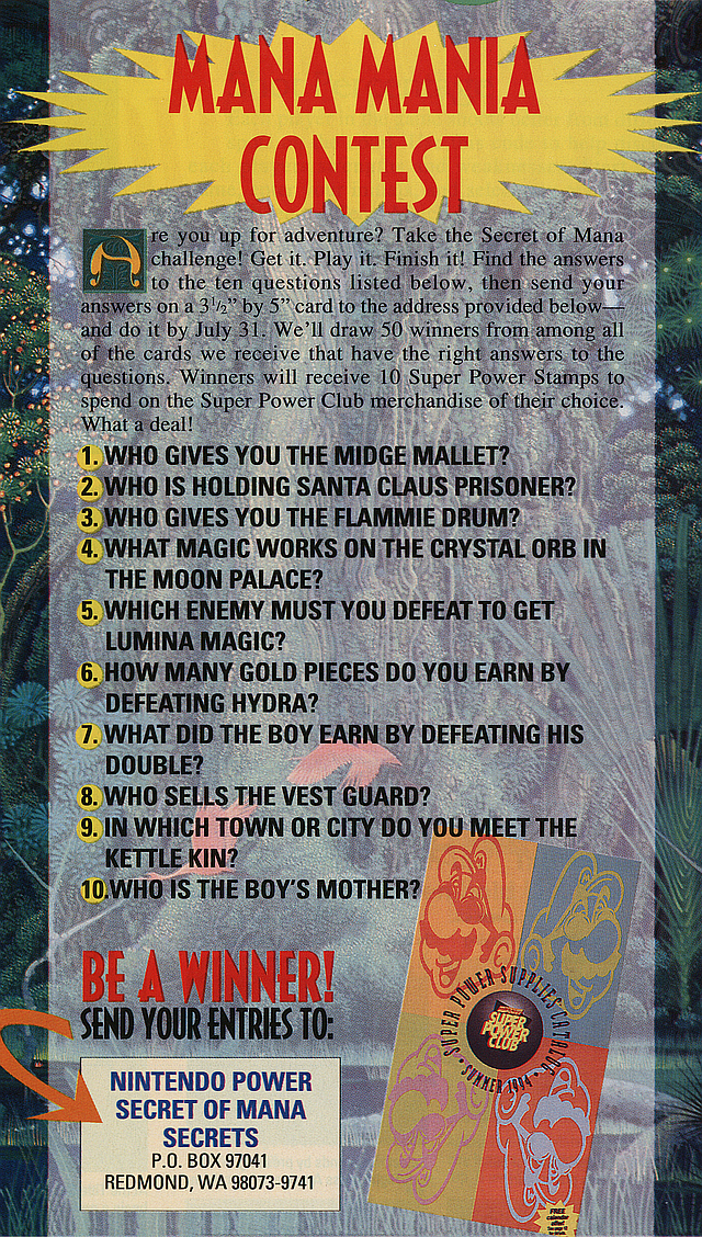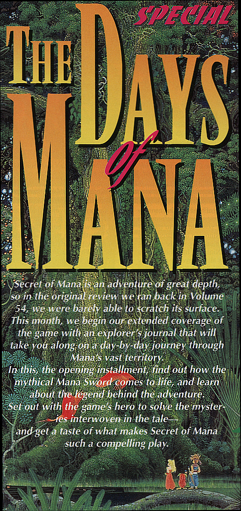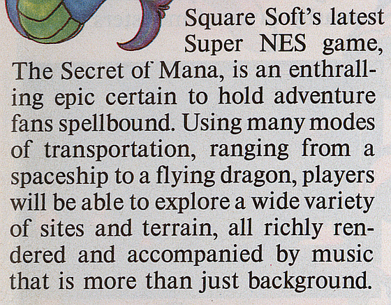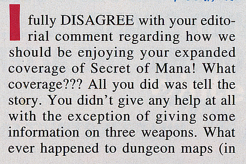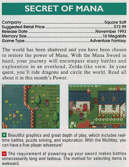 The Top 20 was Nintendo Power’s monthly popularity contest. Secret of Mana hit its peak in this issue at #6. This may have been a disappointing finish considering that the aging Final Fantasy II (IV) was was still on the charts—a longevity feat that SoM wouldn’t go on to match. Final Fantasy III (VI) was Square’s next RPG and would go on to debut at #3.