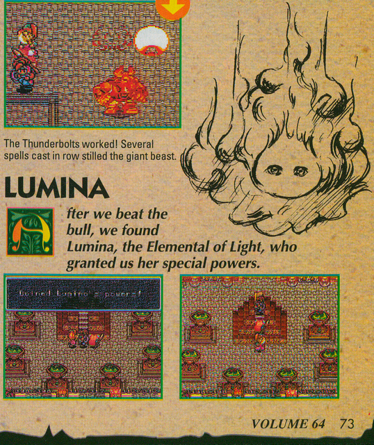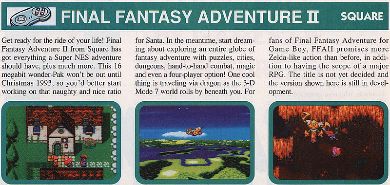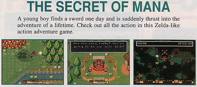 There was a common promotional mantra that Secret of Mana was literally Zelda in every way, except for when it usually wasn’t. Nintendo Power had a bit of that from its first mention in this section. At this point, it was going to be localized as Final Fantasy Adventure II, and it wasn’t quite clear how many players could hop in (another issue said five). Ironically, this month was the original planned launch in Japan; it was eventually pushed back to August. The screenshots are an earlier version of Potos, a cut area east of the Water Palace, and a test with all three characters fighting the Mantis Ant.