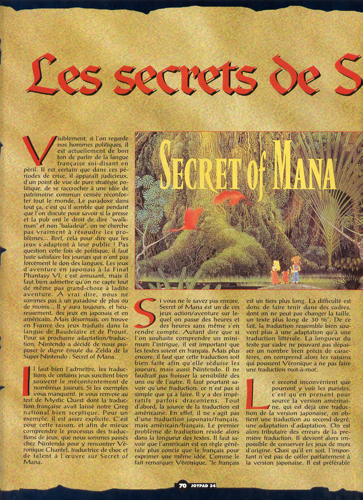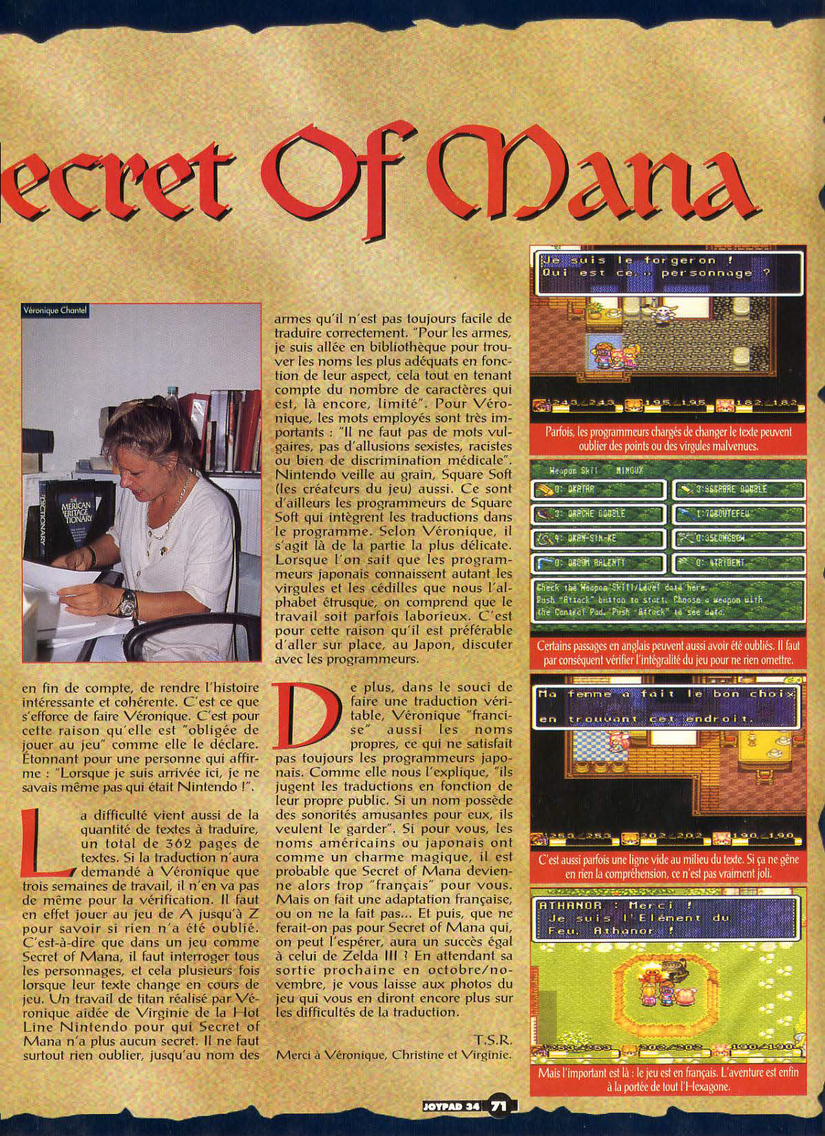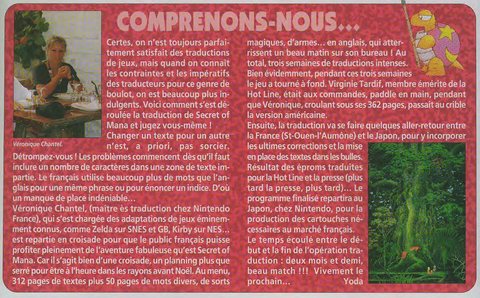 The difficulty also comes from the amount of text to translate---a whopping 362 pages. While the translation only took Véronique three weeks, the same can't be said for the verification [process]. You have to play the game from A to Z to know if anything's been forgotten. That is to say, in a game like Secret of Mana, you have to include all of the characters, and [examine things] several times as their text changes during the game. [This was] a titanic task carried out by Veronique with the help of Virginie from Nintendo for whom Secret of Mana no longer has any secrets. Above all, you can't forget anything, even the names of the weapons that are not always easy to translate. "For the weapons, I went to the library to find the most appropriate names based on their appearance, while taking into account the number of [possible text] characters which is, again, limited." For Véronique, the words used are very important. "There should be no vulgar, sexist, or racist words, [and no] allusion to medical discrimination." Nintendo [also] keeps a close eye on things, as does Squaresoft (the creators of the game). It's also the Squaresoft programmers who integrate the translation into the program. According to Véronique, this is the most delicate part. When you're aware that Japanese programmers know commas and cedillas as much as we do the Etruscan alphabet, you can understand that the work can sometimes be laborious. That's why it's better to go to Japan and speak to the programmers [directly].