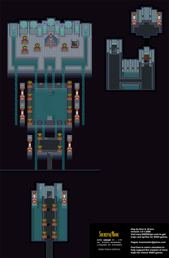 Like all 2D games, we have a projection of the actual idea, and need to fill in the gaps with our mind. Before the remake, I imagined we were walking on a platform over a vast pool of water that we couldn’t see from the camera angle—those waterfalls have to go somewhere. This was confirmed in 2018, but with the limited scope of the graphics, it makes the Water Palace seem smaller than it appears in the 16-bit version. Considering how large the place looks on the outside, I imagine there’s other levels that we can’t see, perhaps a whole labyrinth of rooms at the top. The smooth floors are illuminated with sunlight beaming through stained glass, along with ritual fire.